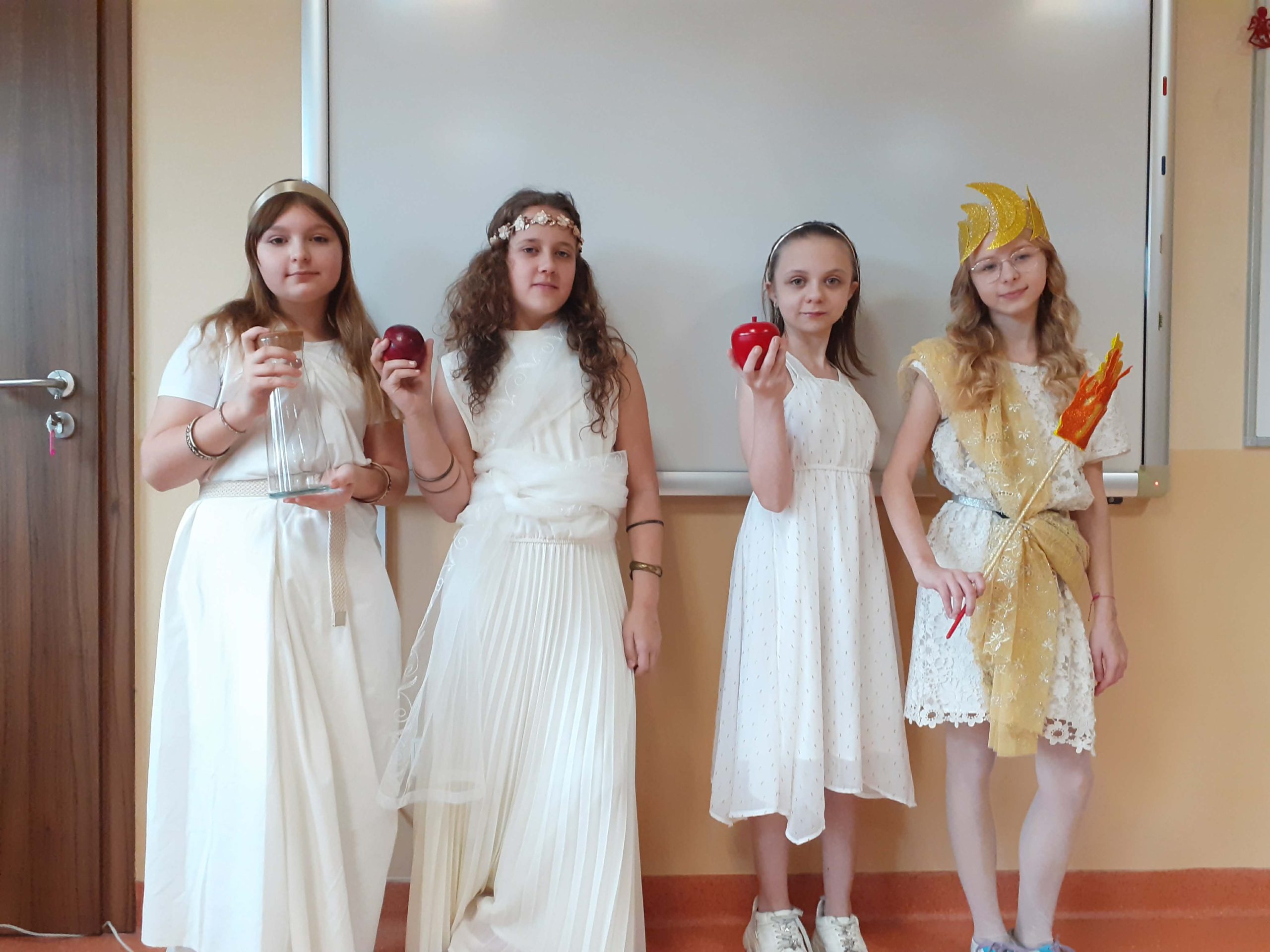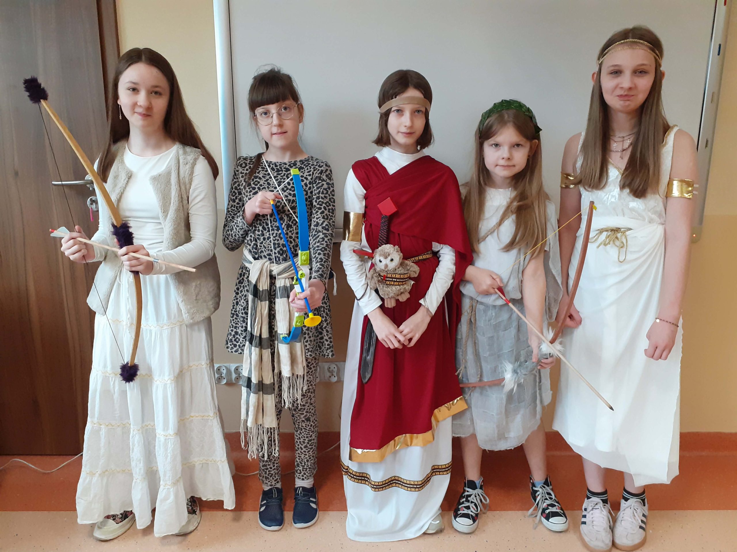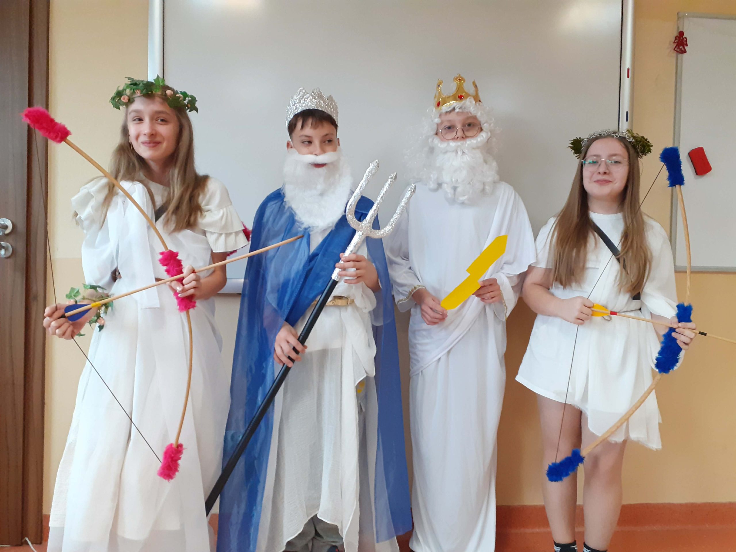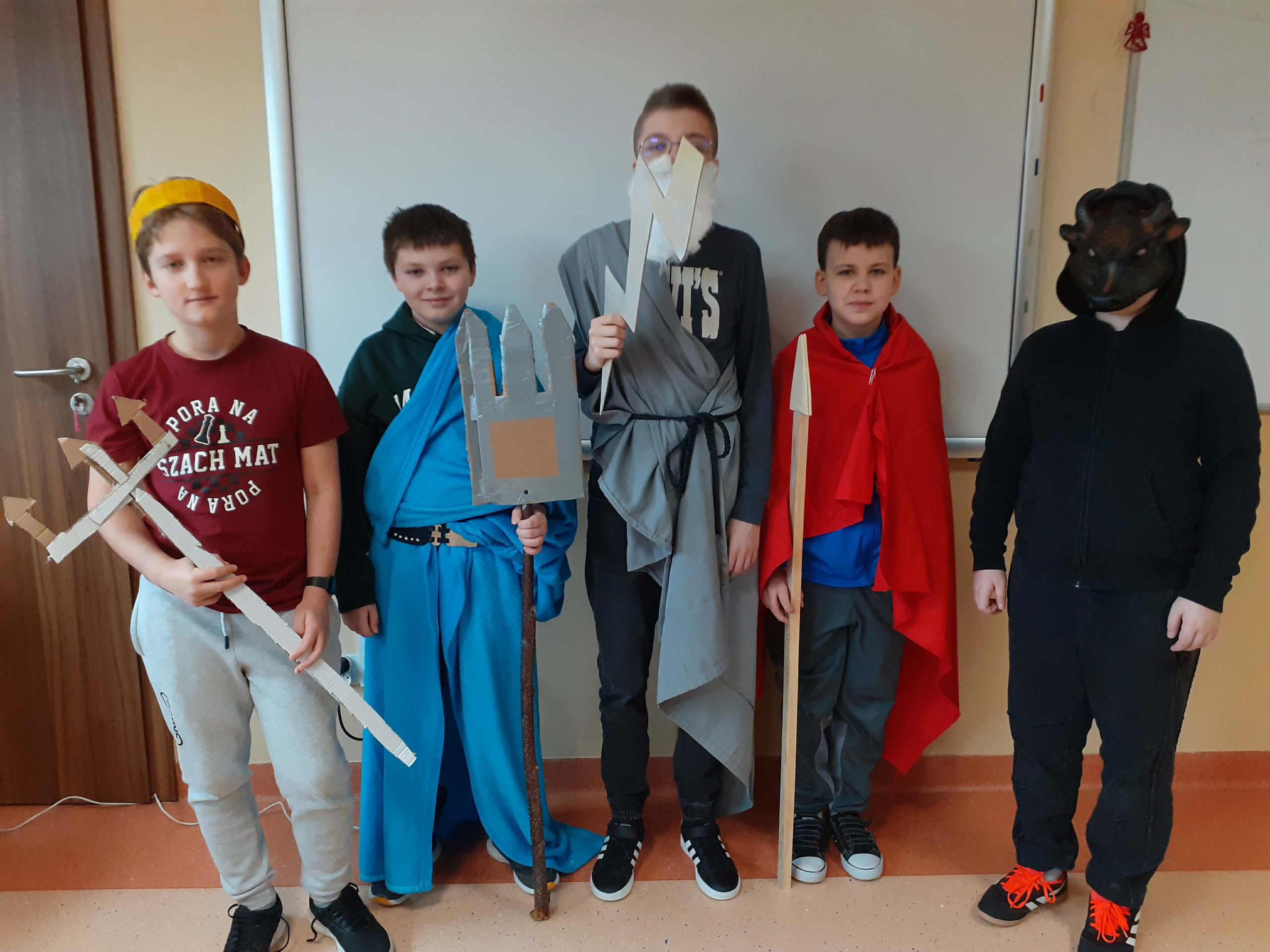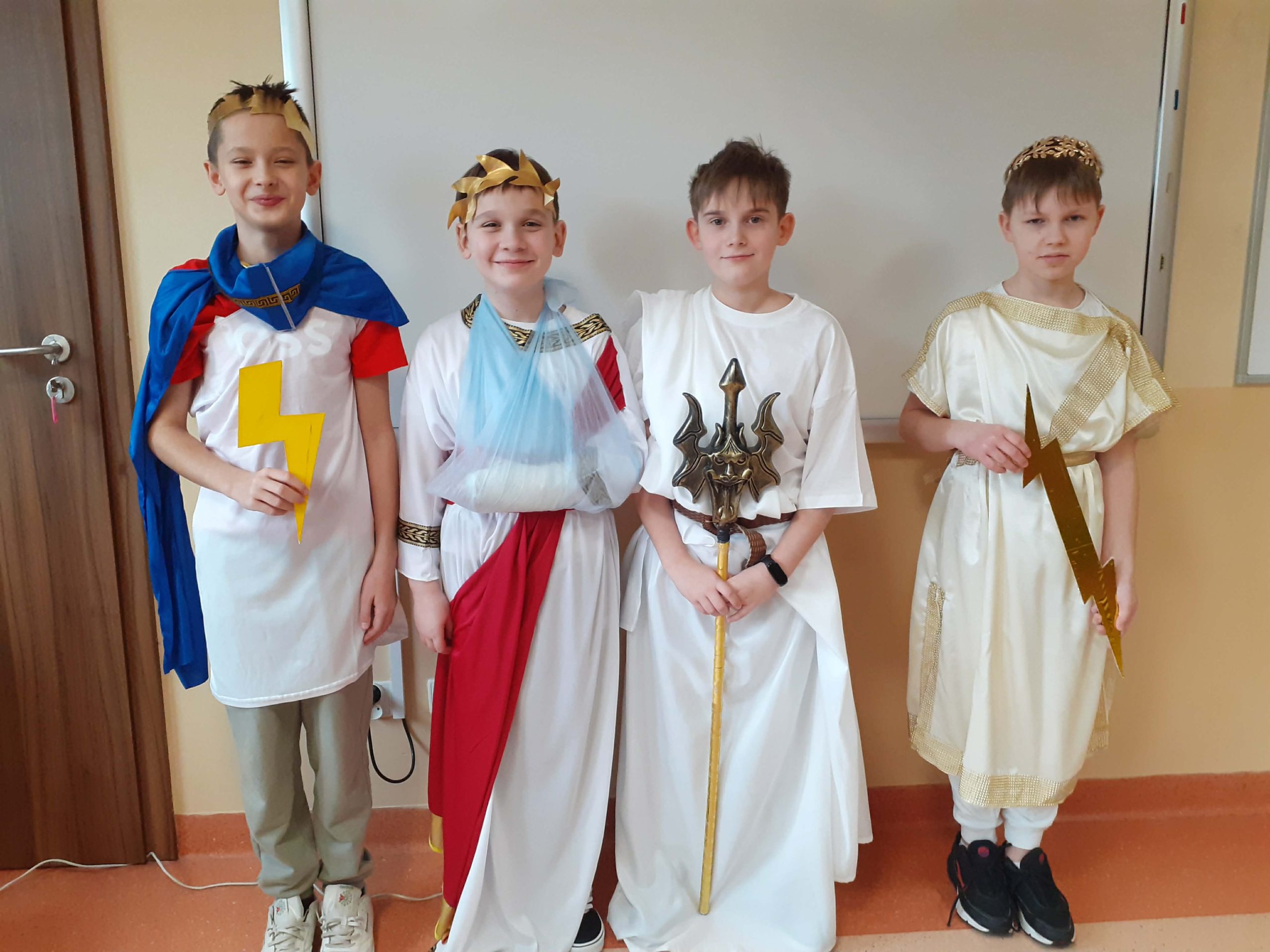 Przez dwa miesiące, na lekcjach języka polskiego, uczniowie z zaangażowaniem poznawali fascynujący świat mitologii greckiej – życie i zwyczaje bogów, oraz ich niesamowite przygody. Zdobyta wiedza nie pozostała jedynie na kartach zeszytów. Podczas finału projektu piątoklasiści zaprezentowali się na forum szkoły, wcielając się w wybraną przez siebie, ulubioną postać mitologiczną.