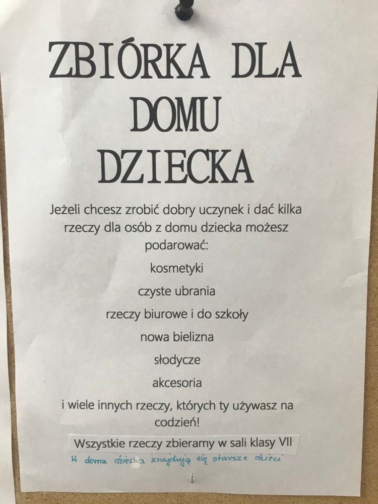 Młodzież, Wychowawcy i Dyrekcja placówki bardzo dziękują wszystkim zaangażowanym w tę zbiórkę. Była ona kolejną akcją dobroczynną, którą będziemy na pewno kontynuować w kolejnych latach. Opiekunowie koła wolontariackiego dziękują Rodzicom i Dzieciom za zaangażowanie. W rewanżu uczniowie naszej szkoły zostali zaproszeni przez rówieśników z Domu Dziecka na integracyjne ognisko przed wakacjami.