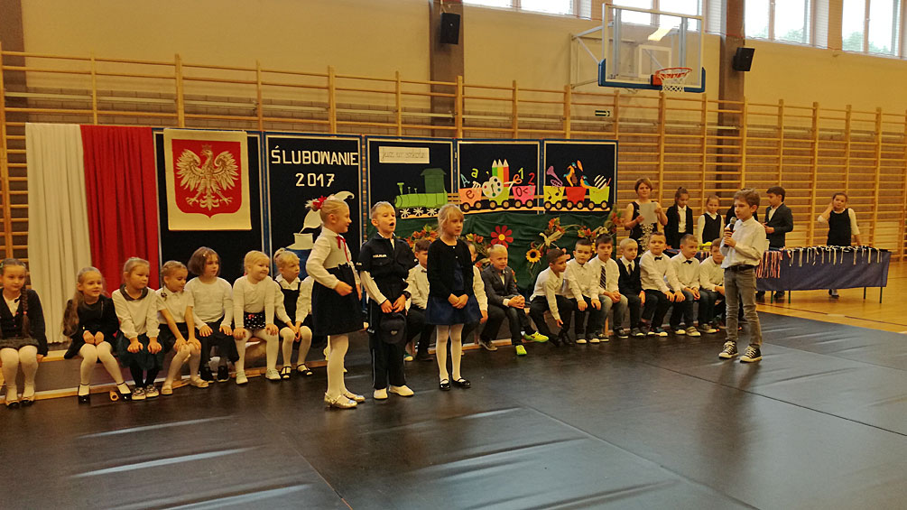 Uroczystość rozpoczęli uczniowie klasy IV, którzy zaprosili do szkoły pierwszoklasistów. Pierwszaki pięknie się przywitały i zaprezentowały ciekawy występ artystyczny. Pierwszoklasiści byli wspaniali, udowodnili, że umieją pięknie recytować wiersze, śpiewać piosenki, wiedzą co to jest ślubowanie, więc otrzymali gorące brawa.