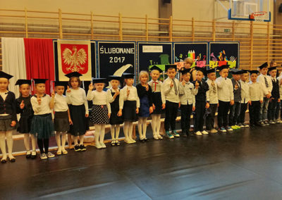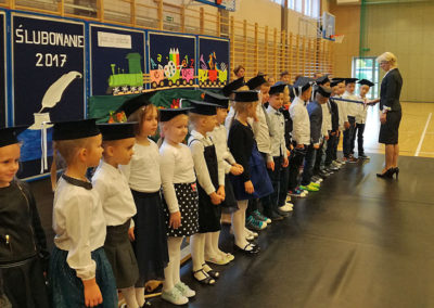 Następnie przystrojeni w „żakowskie” czapki złożyli uroczystą przysięgę i zostali pasowanymi na uczniów naszej szkoły. Z okazji ślubowania, uczniowie klasy I otrzymali wiele nagród i pamiątek. Po uroczystości goście i pierwszoklasiści zasmakowali okolicznościowego tortu i innych smakołyków przygotowanych przez rodziców. Na koniec nowo zaprzysiężeni uczniowie naszej szkoły dali upust rozpierającej ich energii, bawiąc się na parkiecie przy wiązance przebojów dziecięcych.