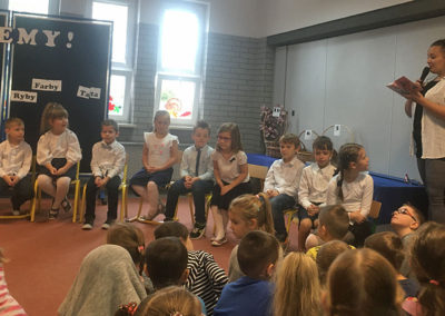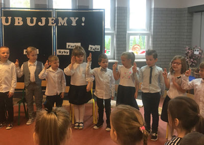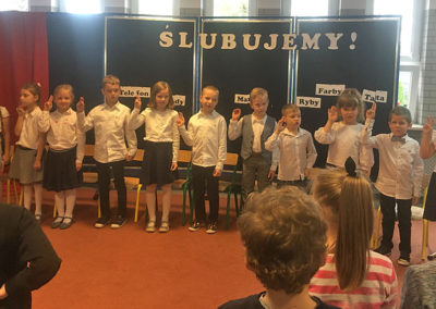 Potem nadszedł moment najważniejszy dla pierwszoklasistów – rozpoczęła się uroczystość ślubowania. Na początku dzieci wspaniale zaprezentowały swoje umiejętności recytatorskie i muzyczne. Po części artystycznej, w niezwykle podniosłej atmosferze, pierwszacy ślubowali być dobrymi Polakami, godnie reprezentować swoją szkołę, a swym zachowaniem sprawiać radość rodzicom i nauczycielom. Następnie pani Dyrektor dokonała symbolicznego pasowania na ucznia. Potem było mnóstwo życzeń i prezentów.