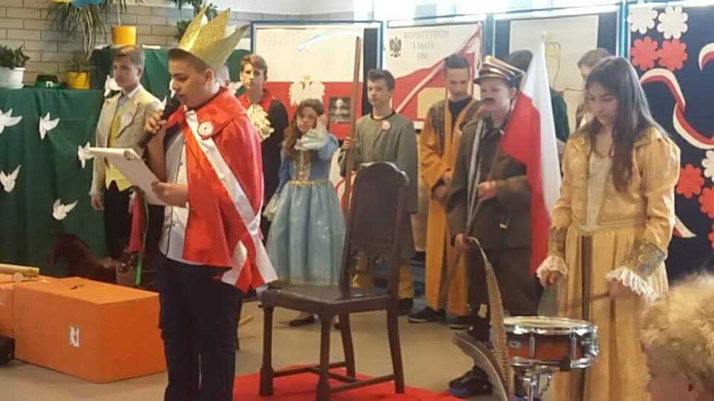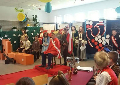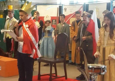 O tych wydarzeniach uczniowie klasy siódmej chcieli przypomnieć młodszym kolegom. Uczniowie na uroczystość przyszli z biało – czerwonymi kotylionami. Akademię rozpoczęto od zaśpiewania hymnu narodowego. Następnie uczniowie w przystępny sposób przedstawili rówieśnikom i młodszym przyczyny i skutki rozbiorów Polski. Emocje i ciszę na sali spowodowały postanowienia króla oraz gra na werblu przez werblistkę podkreślającą wypowiadane przez króla kwestie. Król dla dobra ojczyzny i utrzymania jej granic ogłosił konstytucję za świętą w dziejach narodu polskiego.