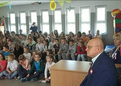 Na zakończenie p. dyrektor Małgorzata Kokocińska podziękowała organizatorom i wykonawcom za piękną lekcje patriotyczną. Uczniowie biorący udział w uroczystości otrzymali z rąk króla Stanisława Augusta Poniatowskiego kolorowankę z jego podobizną.