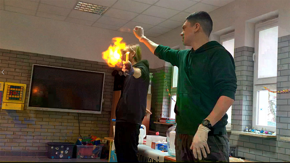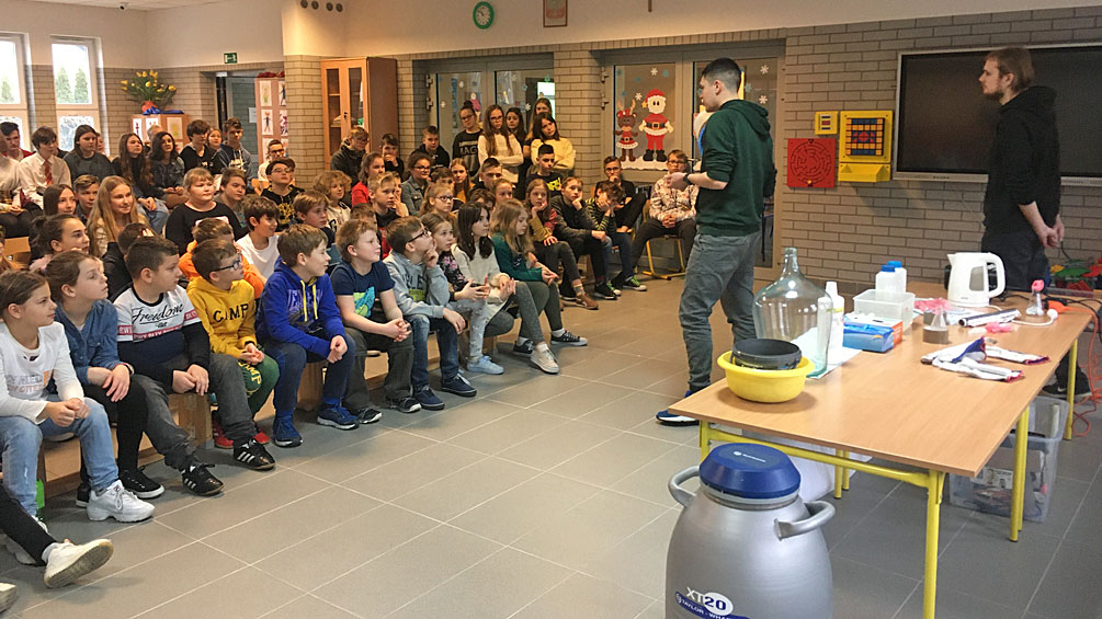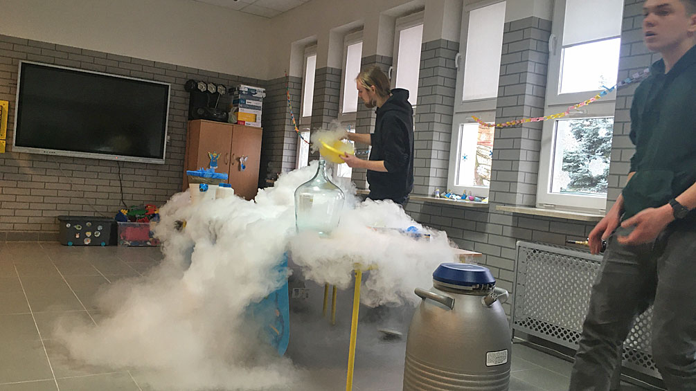 Uczniowie mogli zobaczyć wybuch balonu napełnionego wodorem, czyli w skali mikro doświadczyć jakie były skutki katastrofy sterowca Hindenburg w 1937r. W czasie eksperymentów uczniowie zobaczyli również na czym polega proces kondensacji pary wodnej i co dzieje się z różnymi substancjami w ciekłym azocie. Chętni uczniowie spróbowali zaśpiewać piosenkę po zaczerpnięciu helu. Na koniec wszyscy zmierzyli się z rozwiązaniem „Kolorowego testu”.