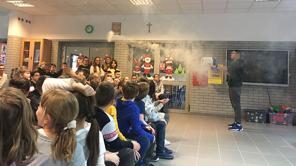 20 stycznia 2020 uczniowie z klas IV – VIII naszej szkoły brali udział w lekcji fizyki prowadzonej przez grupę Zaelektryzowani. Lekcja nosiła tytuł „Fizyka wszędzie styka” i dotyczyła gazów wchodzących w skład powietrza.
