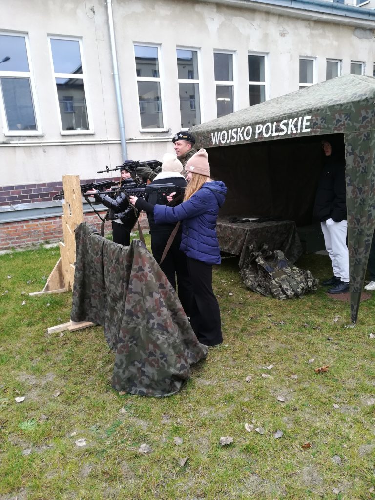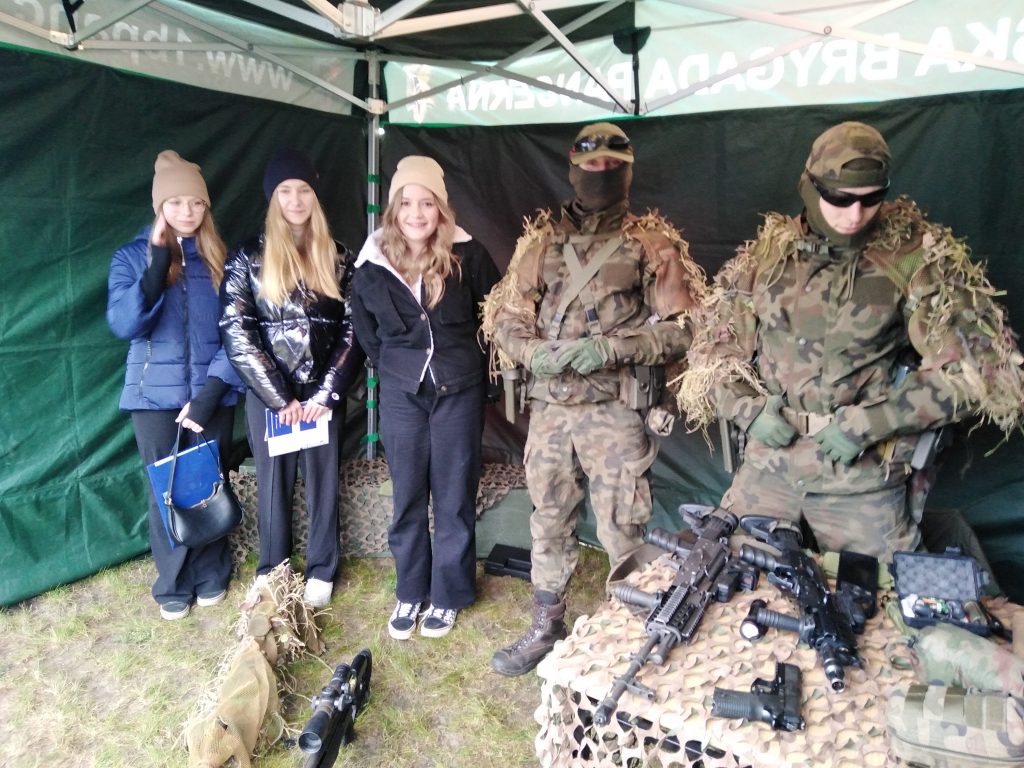 – odwiedziliśmy różne wojskowe stoiska, gdzie otrzymaliśmy dużo gadżetów – smycze, długopisy itp., książki o tematyce historycznej i wojskowej, mapy polityczne świata. W ramach doradztwa zawodowego niektórzy uczniowie i uczennice pobrali informatory zachęcające do szkół średnich i studiów wojskowych. Spotkaliśmy także kadetów z zaprzyjaźnionej szkoły tj. I LO PUL w Wołominie, którzy na czele z Panią Dyrektor Agnieszką Kaczyńską uczestniczyli w święcie jednostki.