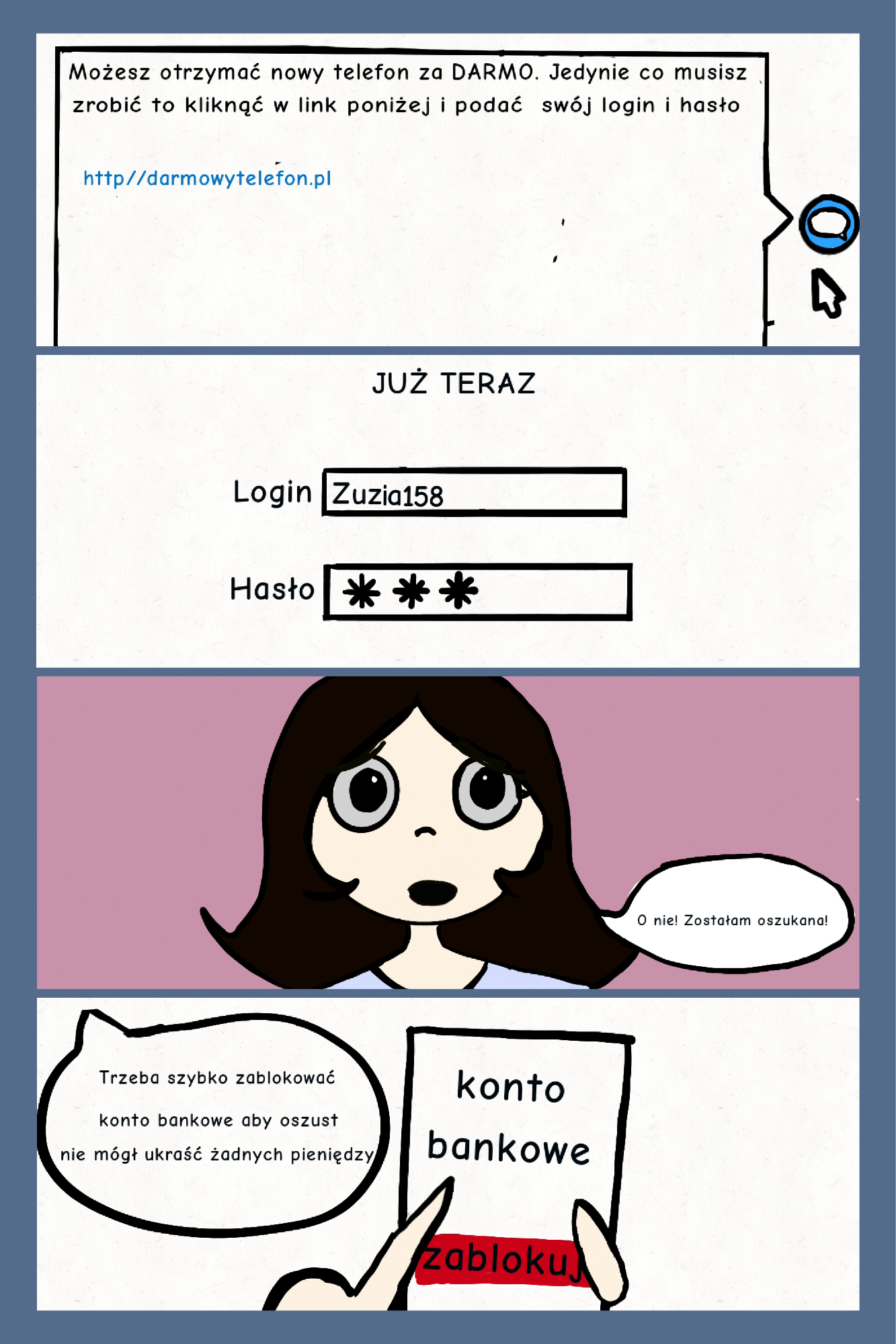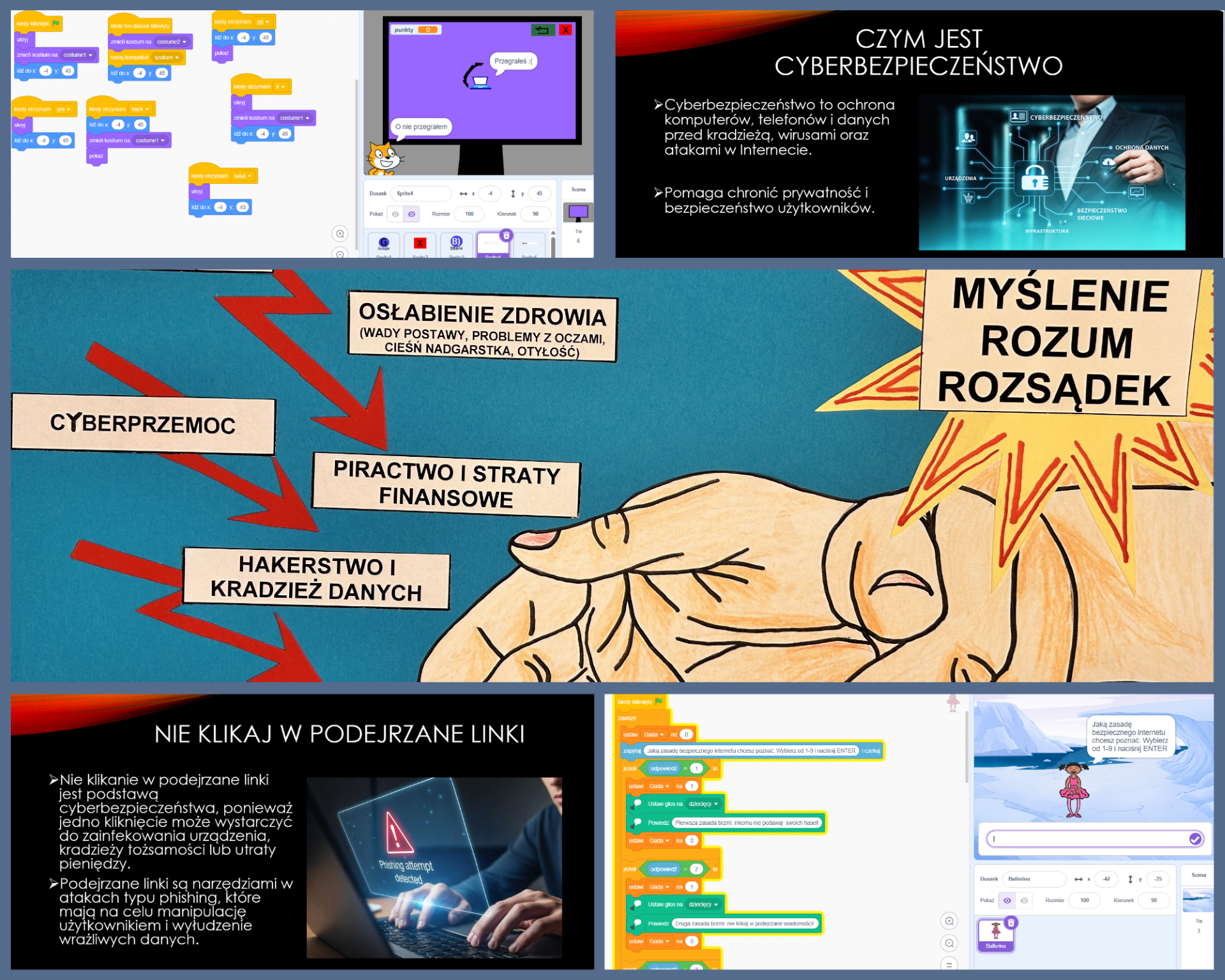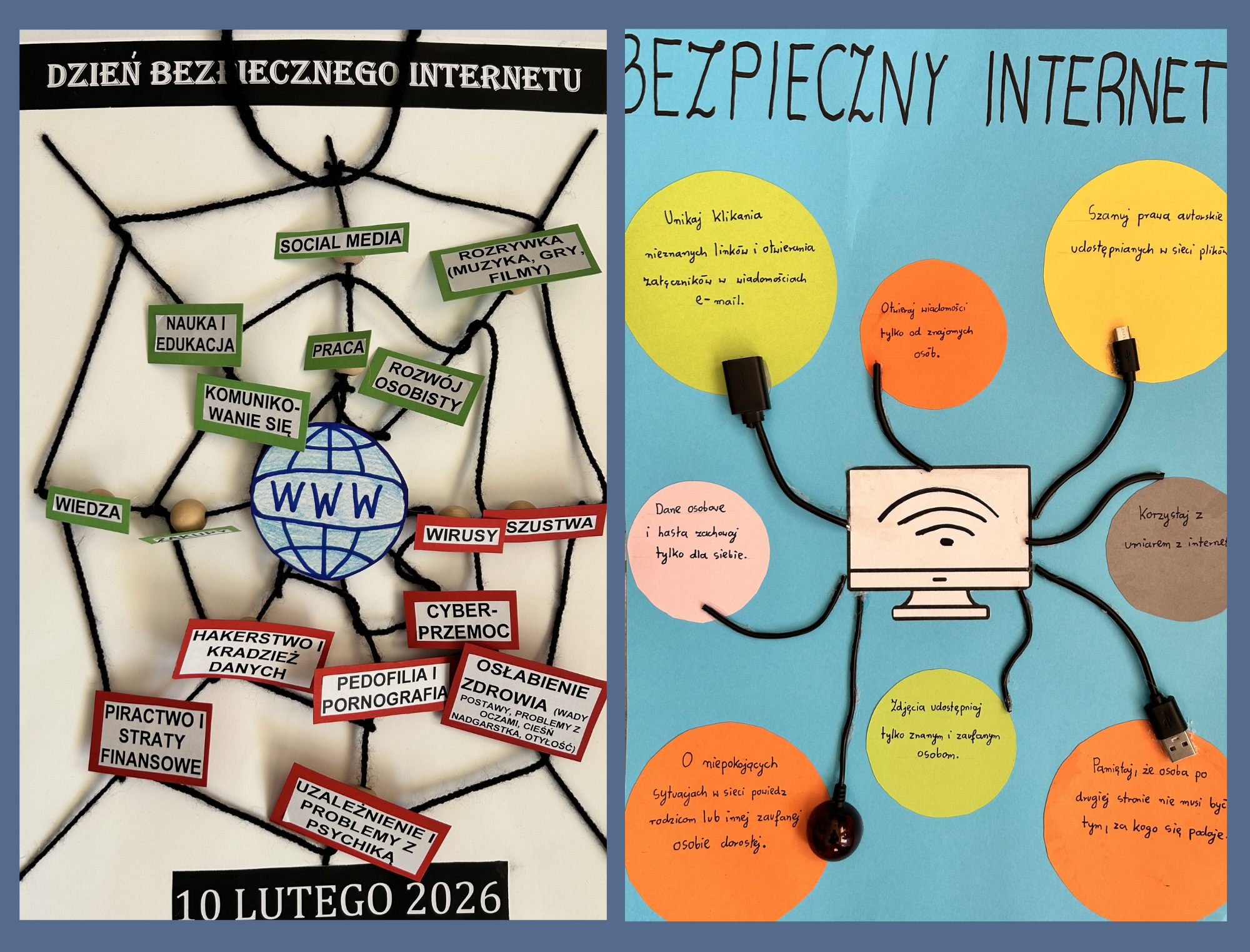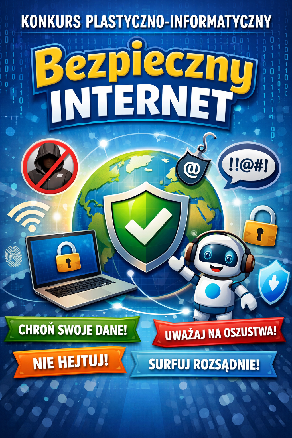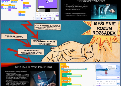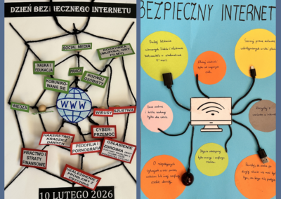 W naszej szkole odbył się konkurs plastyczno-informatyczny „Bezpieczny Internet”, którego celem było zwrócenie uwagi uczniów na zasady bezpiecznego i odpowiedzialnego korzystania z sieci. Uczestnicy przygotowali różnorodne i bardzo pomysłowe prace przedstawiające, jak mądrze korzystać z Internetu oraz jak unikać zagrożeń w świecie online.