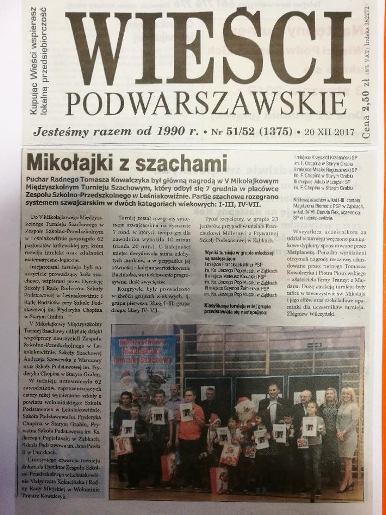 V Mikołajkowy Międzyszkolny Turniej Szachowy odbył się dzięki współpracy nauczycieli Zespołu Szkolno-Przedszkolnego w Leśniakowiźnie, Szkoły Szachowej Andrzeja Szewczaka z Warszawy oraz Szkoły Podstawowej im. Fryderyka Chopina w Starym Grabiu.