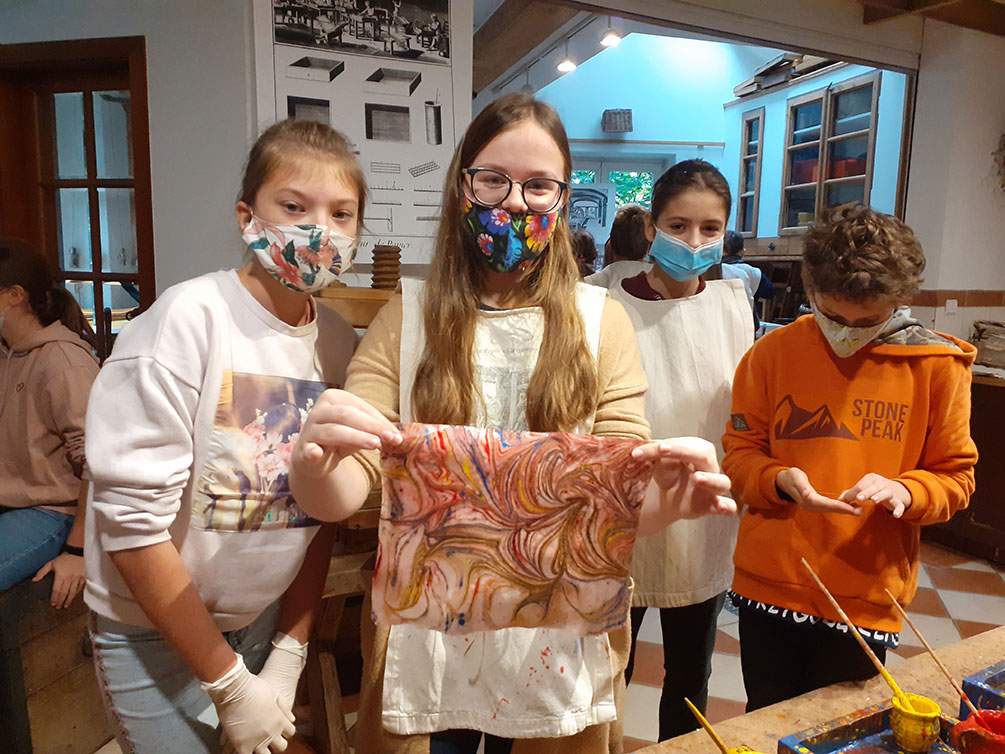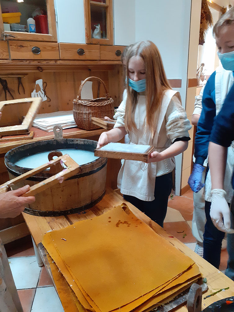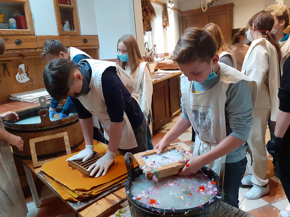 We wtorek 12 października, uczniowie klasy 7 uczestniczyli w warsztatach papierniczych, które odbyły się w Manufakturze Papieru Czerpanego w Kobyłce. Dzieci wysłuchały wykładu na temat rozwoju sztuki papierniczej na świecie. Poznały materiały, na których starożytne narody zapisywały swoją historię: papirus, jedwab, pergamin, gliniane i woskowe tabliczki. Zapoznały się z kolejnymi etapami tworzenia papieru czerpanego, a następnie same, własnoręcznie barwiły i dekorowały papier. To było bardzo ciekawe doświadczenie.