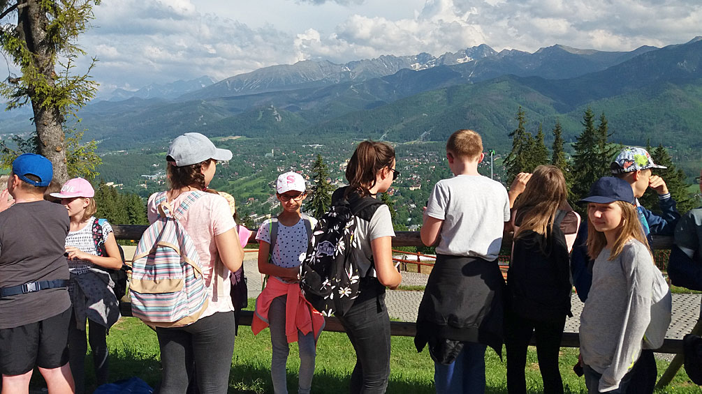 Pierwszy dzień spędziliśmy w podróży, ale już drugiego dnia po pysznym śniadaniu wyruszyliśmy w góry. Pogoda zachęcała do wędrówki, wybraliśmy się z Kuźnic na Polanę Kalatówki. Była to trasa łatwa, miała charakter adaptacyjny. Podziwialiśmy widoki na grzbiet Kasprowego Wierchu oraz otoczenie Doliny Jaworzynki. Na Polanie pan przewodnik przeprowadził prawdziwą lekcję przyrody, dzieci orientowały mapy w terenie i rozpoznawały szczyty nas otaczające. Poznawaliśmy tatrzańskie rośliny, obserwowaliśmy ptaki i zwierzęta. Po obiedzie wybraliśmy się koleją linową na Gubałówkę. Z góry rozpościerał się wspaniały widok nie tylko na Tatry Wysokie i Zachodnie na czele z Giewontem, ale także w przeciwnym kierunku na Podhale, Gorce, Beskid Sądecki, Pieniny i Babią Górę. Następnie powędrowaliśmy na Butorowy Wierch i wyciągiem krzesełkowym dotarliśmy do Kościeliska.